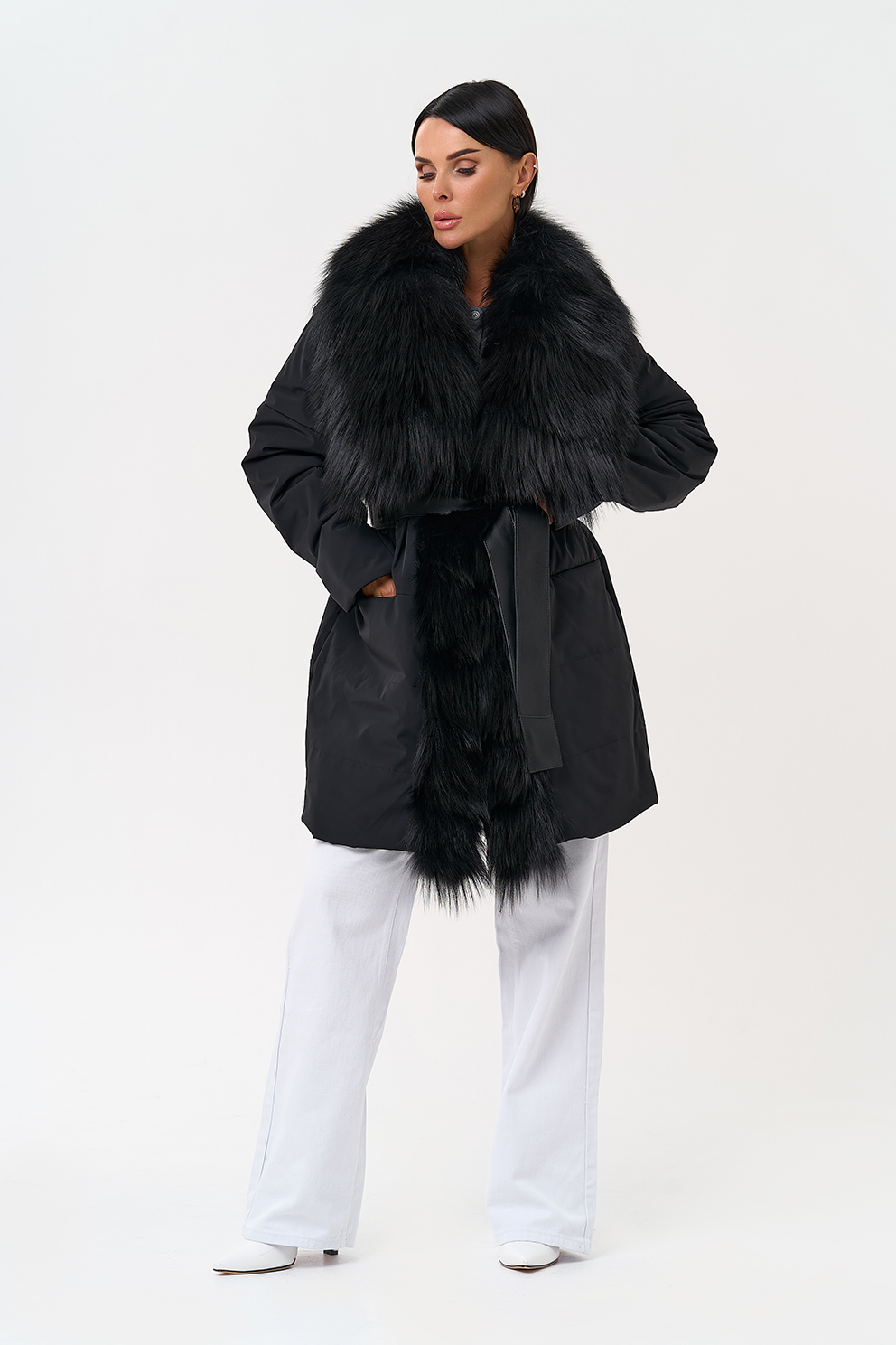 Вид застежки - кнопки, брендированный пояс из натуральной кожи